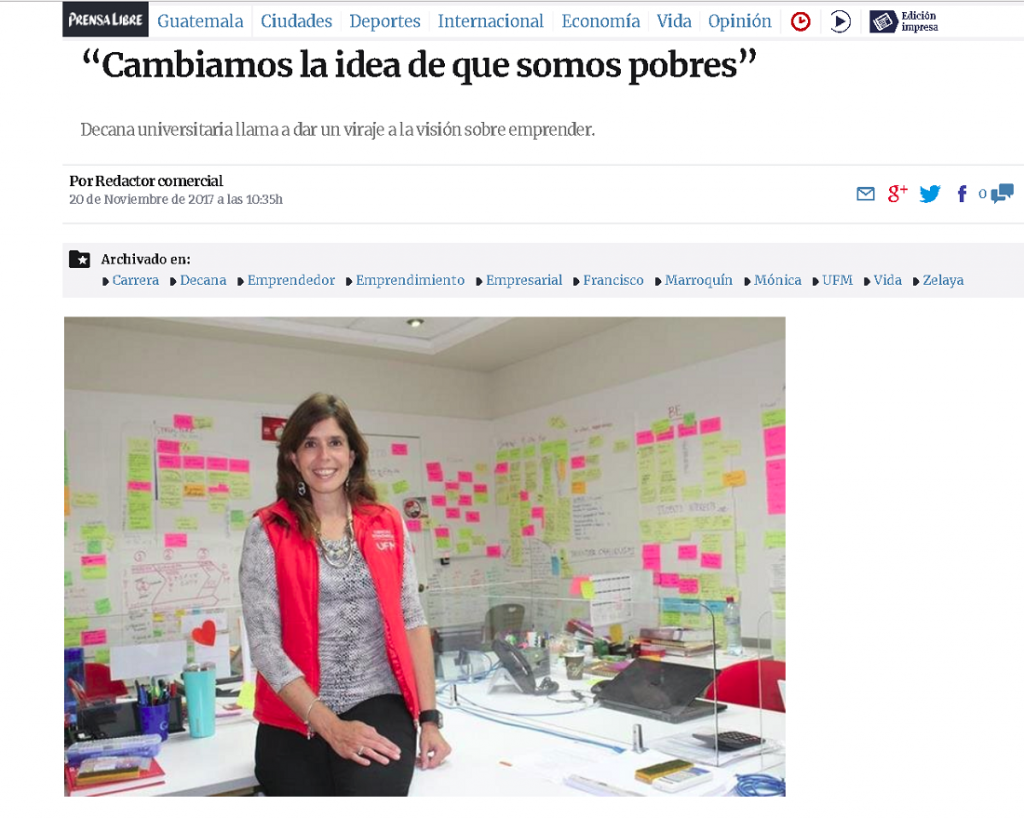 Cambiamos la idea de que somos pobres, decana universitaria llama a dar viraje a la visión sobre emprender, se titula la entrevista a Mónica de Zelaya, decana de la Facultad de Ciencias Económicas de la Universidad Francisco Marroquín, publicada por el diario Prensa Libre el 20 de noviembre de 2017.
