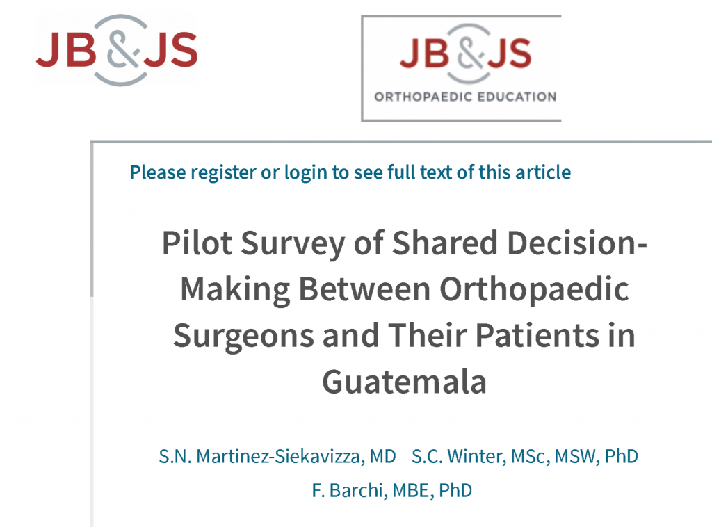 Pilot Survey of Shared Decision-Making Between Orthopaedic Surgeons and Their Patients in Guatemala es el nombre del artículo académico publicado en la Journal of bone and joint surgery, una de las revistas científicas de mas alto impacto en Traumatología y Ortopedia, cuyo autor principal es el profesor Martínez y que contó con la colaboración de Pedro Molina Verluys, médico egresado de Medicina UFM y de los profesores Francis Barchi y Samantha Winter de la Universidad de Rutgers. Este estudio fue llevado a cabo en Guatemala y está accesible en el siguiente enlace:  goo.gl/Kp9U7t.