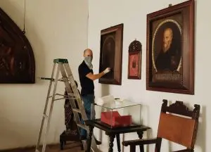 El curador, Martín Fernández, mientras trabaja en un retrado de Pedro de Betancourt.