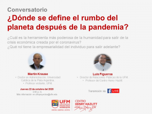 ¿Dónde se define el rumbo del planeta después de la pandemia? ¿Cuál es la herramienta más poderosa de la humanidad para salir de la crisis creada por el coronavirus? ¿Qué rol tiene la empresarialidad de los individuos para salir adelante? Estas son algunas de las preguntas que Martín Krause abordará el jueves 22 de octubre de 2020, a las 5:00 p. m. (Hora de Guatemala y Centroamérica).