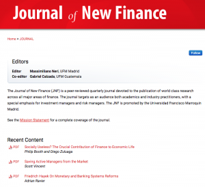 El Journal of New Finance es una revista trimestral, revisada por pares, que se dedica a la publicación de investigaciones de clase mundial en las áreas principales de las finanzas. Está dirigida a un público tanto académico como profesional de la industria, con un énfasis especial en los gerentes de riesgo e inversión. El JNF es promovido por la Universidad Francisco Marroquín y el editor en jefe es Massimiliano Neri.