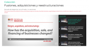 Fusiones, adquisiciones y reestructuraciones, en compañía de practioners locales e internacionales fueron los temas de cuatro conversatorios organizados por la Escuela de Negocios, de la Universidad Francisco Marroquín, durante octubre y noviembre de 2020. Las actividades contaron con más de 1,150 participantes de Guatemala, Estados Unidos, Panamá y otros países de la región.