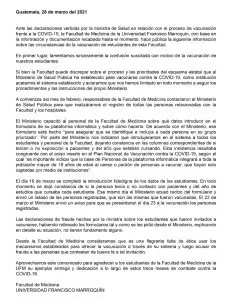 Si bien la Facultad puede discrepar sobre el proceso y las prioridades del esquema estatal que el Ministerio de Salud Pública ha establecido para vacunarse contra la COVID-19, como institución acatamos el sistema establecido y aclaramos que nos hemos limitado en todo momento a seguir los procedimientos y las instrucciones del propio Ministerio.