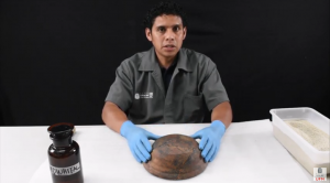 Esta demostración forma parte de la serie de Conservación y restauración de cerámica prehispánica. González muestra los procedimientos en un cuenco en el que fue usado un adhesivo inapropiado. Principia con pruebas de diferentes solventes para retirar el adhesivo en cuestión, continúa con la separación de tiestos pegados y sigue con la eliminación de los restos de pegamento con mucha paciencia y precaución. Luego de la limpieza, el restaurador procede a unir los tiestos, de nuevo, con adhesivo apropiado; cada tiesto unido individualmente cada 24 horas hasta que el cuenco está completo.