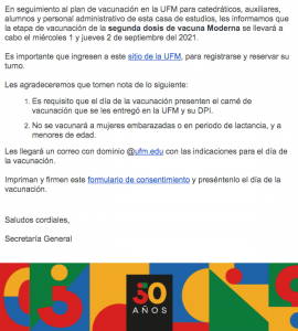 Les llegará un correo con dominio @ufm.edu con las indicaciones para el día de la vacunación.
