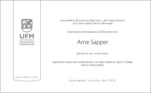 Los miembros del Comité de Fiduciarios y del Consejo Directivo de la Universidad Francisco Marroquín lamentamos profundamente el fallecimiento de Arne Sapper, fiduciario de esta casa de estudios.