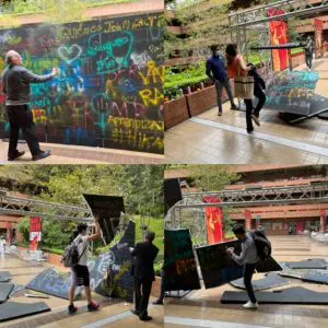 En el ágora, los asistentes se reunieron para escribir mensajes de libertad en un muro que luego fue derribado.  El rector, Ricardo Castillo A., escribió en el muro y asistió al momento de su derribamiento. El muro recordó los obstáculos que enfrentan la libertad y sus defensores, así como el Muro de Berlín. La violencia y la imposición que representa el muro contrasta el espíritu liberal de tolerancia, diálogo y evolución.