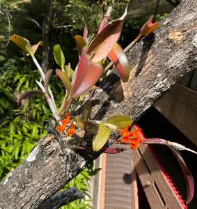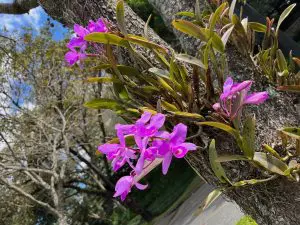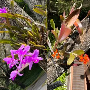 Las Guarianthe skinneri y las Guarianthe auranticaca son las flores moradas y anaranjadas que ves en algunos árboles del campus. El híbrido natural entre ambas especies se llama Guarianthe guatemaltensis.