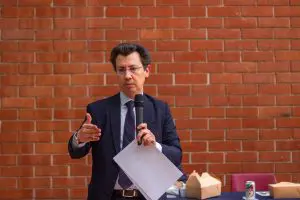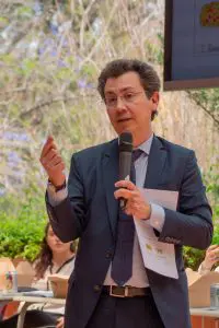 Fernández-Samaniego es socio de la firma Ernst & Young y de la firma Samaniego Law, y el título de la conferencia fue Mediation: An effective process to resolve international complex commercial disputes dirigida a los estudiantes que cursan la clase de Contratos mercantiles, misma que es dictada por el profesor Pedro Mendoza Montano, en el cuarto año de la carrera de Derecho.