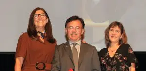 Oswaldo Chinchilla, el homenajeado, acompañado por Barbara Arroyo y Ingrid Klanderud de Figueroa, directivas del museo Popol Vuh. (Foto museo Popol Vuh.