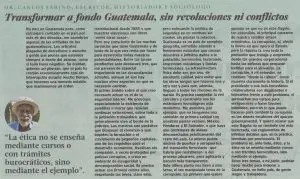 Transformar a fondo Guatemala, sin revoluciones, ni conflictos e identificar los errores en la historia del país son las propuestas de Carlos Sabino y Johann Melchor, profesores de la Universidad Francisco Marroquín, en un reportaje titulado «Un objetivo común: el bien de Guatemala», publicado por el diario Prensa Libre el 11 de septiembre del 2022.