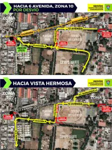 Los cierres, según las indicaciones, son dos: a) en el viraje a la izquierda sobre la 32 Calle, yendo por la 12 Avenida de la zona 5; y b) en la 6 Avenida A, entre el Campo Marte y el antiguo estadio del Ejército, permanecerá cerrado el viraje para la calle Mariscal.