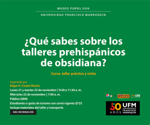 El curso Talleres Prehispánicos de Obsidiana es organizado por el museo Popol Vuh, de la Universidad Francisco Marroquín, y será impartido por Edgar Carpio Rezzio.