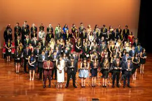 Los graduandos distinguidos entonan el Himno de la UFM. Foto por Juan Pablo Martínez.
