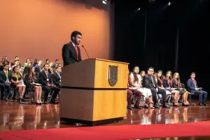 Durante el acto, el rector de la Universidad Francisco Marroquín, Ricardo Castillo A., se dirigió a los graduados distinguidos y dijo: «Cuando llegaron con nosotros, ya tenían una vida que aspiraba a ser plena, porque eligieron la Marroquín. Eligieron venir a una universidad donde les íbamos a invitar a ser libres y permitirles actuar por ustedes mismos: tomar sus propias decisiones y atreverse a defenderlas. Ustedes han aprendido aquí que ser libres para actuar conlleva ser responsables de cada uno de sus actos; que cada vez que eligen han de asumir las consecuencias de esa elección; que pueden equivocarse y que han de dar la cara por los propios errores, para aprender de ellos».