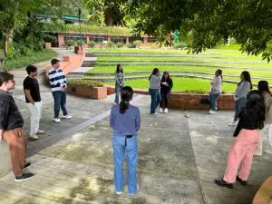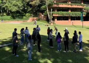 Para el curso de Comunicación, que imparten Elena Merino y Catherine Valenzuela en el Instituto de Estudios Políticos y Relaciones Internacionales se practican dinámicas de teatro e improvisación para fortalecer habilidades, en el Jardín Manuel F. Ayau.