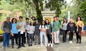Estudiantes de Cine, frente al busto de Francisco Marroquín, luego de conversar sobre ideas de Hayek. Foto por Luis Figueroa.
