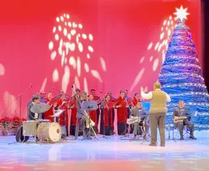 Lester Godínez y su septeto alegraron también al público con Rodolfo, el reno de la nariz roja, y con Santa Claus viene al pueblo. El coro Ricardo del Carmen interpretó Gloria al mundo.