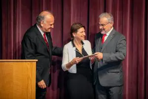 El rector, Ricardo Castillo A. (izquierda) y el secretario general, Ramón Parellada (derecha) le entregaron a la doctora Elena Leontjeva una bufanda de la UFM. Foto por José Pablo Martínez Toruño.