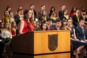 Durante este acto, en honor a los graduandos distinguidos, fueron entregadas las distinciones summa cum laude, magna cum laude y cum laude a quienes se graduaron con honores. En este acto, las palabras en nombre de los graduandos distinguidos estuvieron a cargo de Miranda Romero, del Departamento de Psicología, que se graduó summa cum laude.