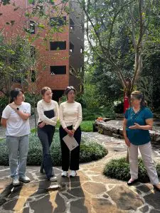 Yolanda de Sandoval, a la derecha, conversa con estudiantes en la Plaza Adam Smith. Foto de Nancy Valle.