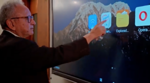 Fernando Monterroso, ex rector y profesor, hace uso de una de las pantallas digitales. Foto por CETA.