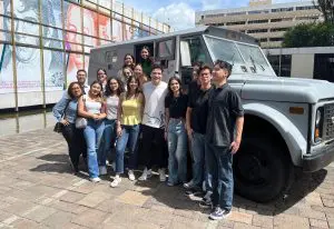 Estudiantes de Proceso Económico II, de la UFM, junto a un camión blindado. Foto por Luis Figueroa.