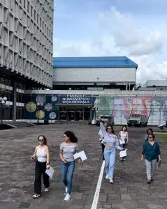 Estudiantes de la UFM, acompañados por la profesora Yolanda de Sandoval, en la Plaza Carlos Mérida. Foto por Luis Figueroa.