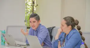 Camilo Bello y Karen Schlosser en el salón Carl Menger, de la UFM. Foto por Natalia Marcucci.