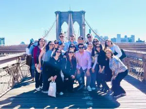 Frente al Puente de Brooklin, los estudiantes de la FCE que participaron en el Marketing and Advertising Study Tour 2024. Foto de l a FCE.