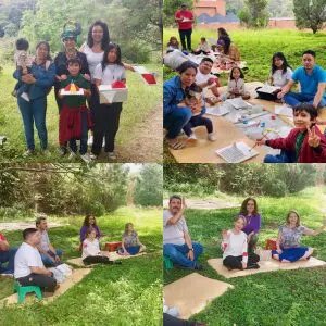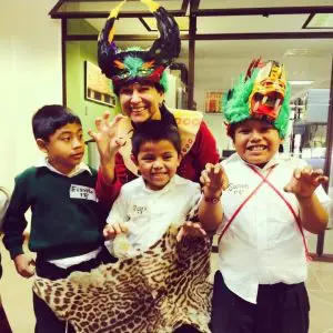 Sylvia Valiente, acompañada por niños, es miembro del equipo de voluntarios del Museo Popol Vuh. Foto de Sylvia Valiente.