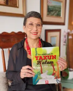 Sylvia Valiente muestra un ejemplar de Las aventuras de Yaxun B´alam. Foto de Sylvia Valiente.