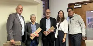 El rector, Ricardo Castillo A.; Kim Tan,Gary Hopwood, Renée Ramirez y José González. Foto por Luis Figueroa.
