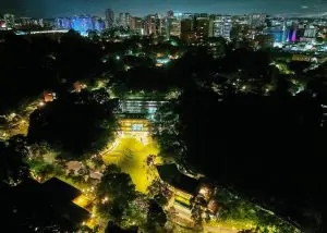 Vista nocturna del Edificio Académico y del Jardín Manuel F. Ayau en la UFM. Foto por Harry Díaz.