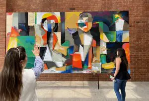 Temporalmente, el mural de Doskuno se halla en el vestíbulo del Auditorium Juan Bautista Gutiérrez. Foto por Luis Figueroa.