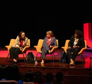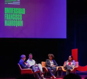 Olga González y Laritza Diversent en conversación con Claudia Rosales, coordinadora de proyectos de la UFM. Foto de UFM.