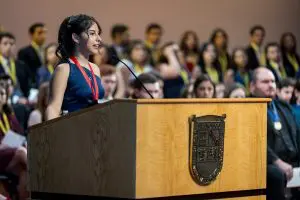 Acto seguido, Daniela Vargas Miralles, graduada summa cum laude de la Facultad de Ciencias Económicas, compartió unas palabras en nombre de sus compañeros y recordó que la libertad y la responsabilidad son inseparables. «Manuel F. Ayau nos enseñó que las ideas gobiernan el mundo y que, si las ideas están equivocadas, el mundo tomará un rumbo equivocado. Seamos la minoría audaz, valiente y dispuesta a marcar la diferencia; y que este reconocimiento no sea solo un logro, sino un compromiso», dijo.