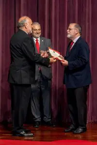 Tyler Cowen, a la izquierda. recibió el diploma de Profesor Visitante de manos del rector, Ricardo Castillo A. acompañado por el secretario general, Ramón Parellada. Foto por Roberto Sacasa.