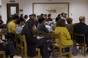 «José Fernando Orellana, egresado de la Facultad de Derecho de la UFM, estuvo a cargo de dirigir el diálogo con Carlos Sabino. Orellana y Sabino nos contaron que este intercambio comenzó entre ellos hace meses, mientras esperaban su equipaje en un aeropuerto», relató la directora de UFM Ediciones.