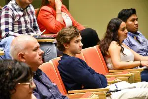 Vista parcial del público durante el encuentro de César Mariel Albert con estudiantes y profesores de la Escuela de Negocios de la UFM. Foto de Escuela de Negocios.