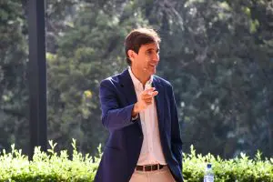 César Mariel Albert en la Terraza Rose Friedman, de la Universidad Francisco Marroquín. Foto de Escuela de Negocios.