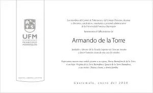 Los miembros del Comité de Fiduciarios y del Consejo Directivo, decanos y directores, catedráticos, estudiantes y el personal administrativo de la Universidad Francisco Marroquín lamentamos el fallecimiento de Armando de la Torre fundador y director de la Escuela Superior de Ciencias Sociales y doctor honoris causa de esta casa de estudios.