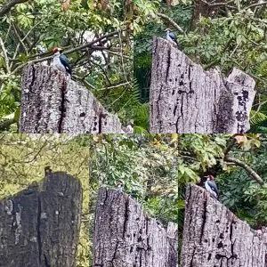 El ave de la foto fue captada mientras picoteaba un tocón, mientras compañeros suyos volaban a su alrededor. Los carpinteros usan sus picos para perforar la madera, alimentarse de larvas y abrir agujeros para anidar. Se llama tamborileo al sonido rítmico característico que producen al golpear, con su pico, los árboles. Pueden golpear hasta dieciséis veces por segundo y repiten esa acción miles de veces al día sin sufrir daños cerebrales, gracias a su adaptación craneal.