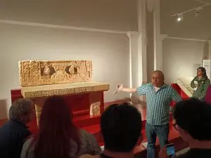 Camilo Luin, curador del Museo Popol Vuh, explicando el Trono de Piedras Negras en el Museo Nacional de Arte Maya. Foto de Camilo Luin.