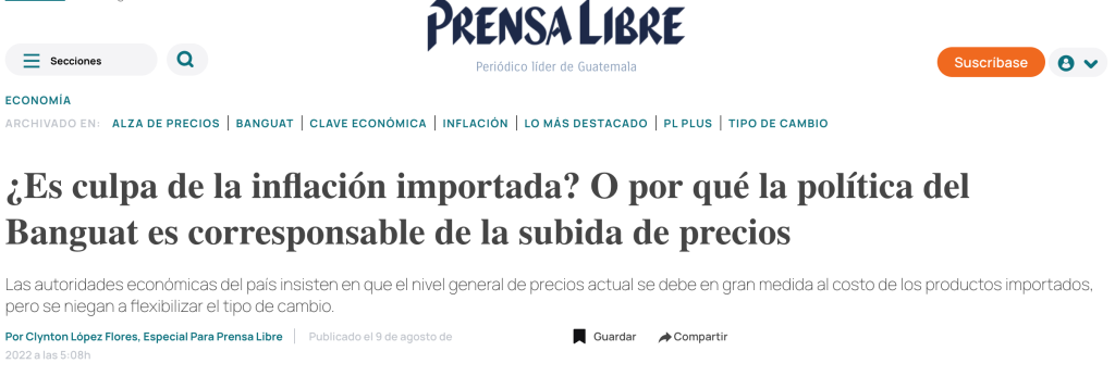 «No hay evidencia, sino muchos argumentos —que difícilmente podrían tomarse como evidencia— de que la inflación no es un fenómeno monetario. De esta forma, también se puede responsabilizar directamente al Banguat de la pérdida de rumbo, en términos de inflación», explicó Clynton López, director de la carrera de Economía en la Facultad de Ciencias Económicas de la Universidad Francisco Marroquín.
