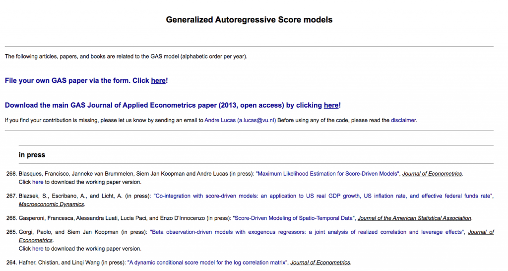 En la Escuela de Negocios de la Universidad Francisco Marroquín, y desde 2013, un grupo de profesores y estudiantes de esta casa de estudios conforman el Guatemalan Econometric Study Group. Desde entonces han estado publicando literatura sobre score-driven time series models.