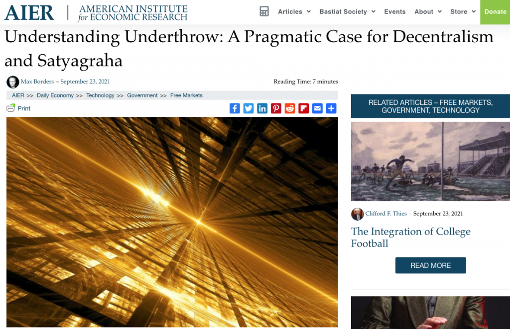 Una de las universidades más interesantes del mundo es la Universidad Francisco Marroquín en Guatemala. La UFM enseña el espíritu empresarial y los profesores son ellos mismos emprendedores, escribió Max Borders en un artículo titulado Understanding Underthrow: A Pragmatic Case for Decentralism and «Satyagraha», publicado por el American Institute for Economic Research.