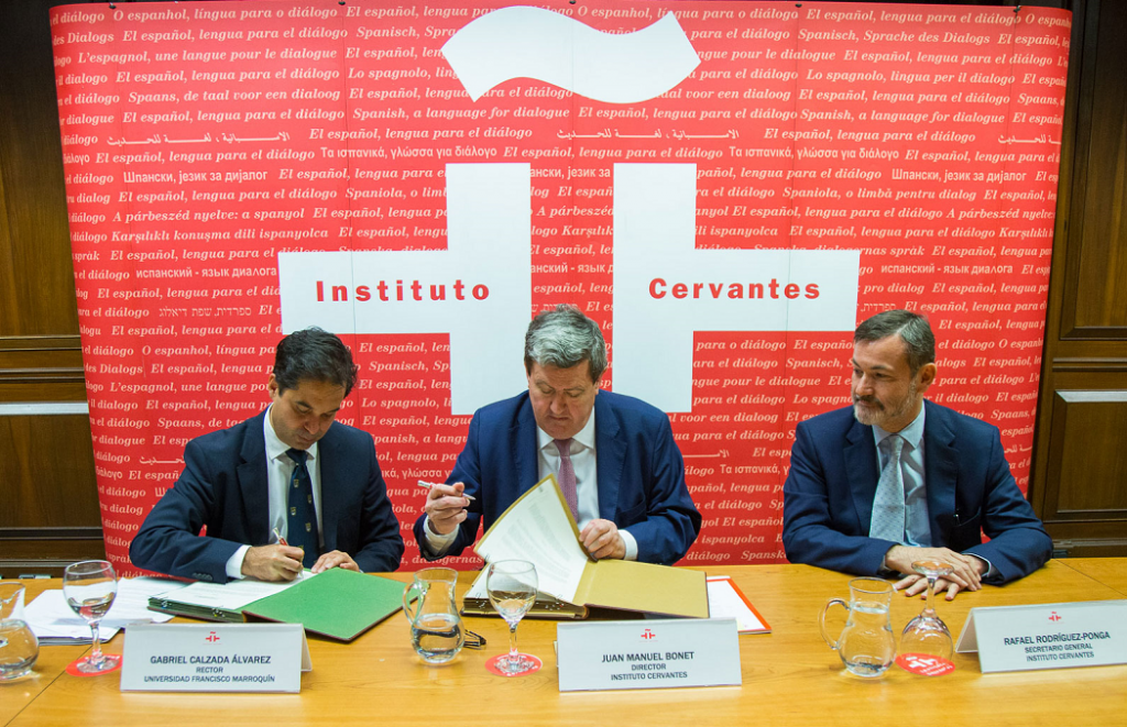 Directivos de la Universidad Francisco Marroquín y del Instituto Cervantes luego de la firma del convenio entre ambas organizaciones.