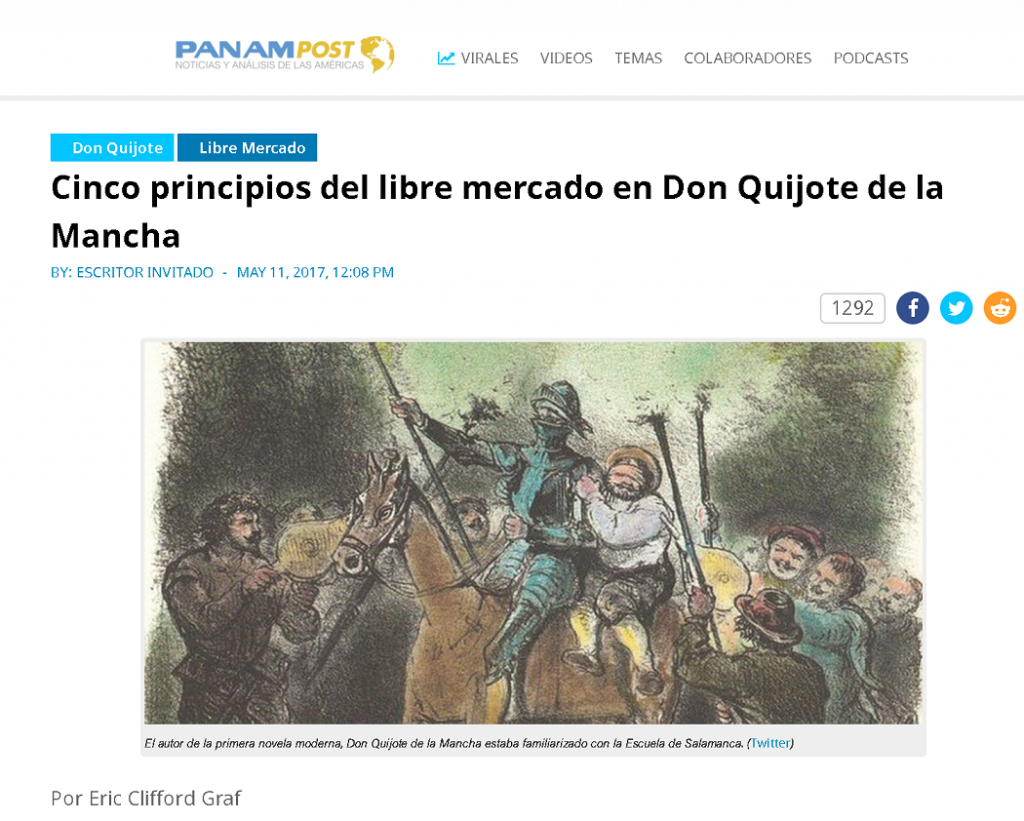 Cinco principios de liber mercado en Don Quijote de la Mancha, se titula el artículo escrito por el profesor Eric Clifford Graf en relación a las ideas económicas que se encuentran en la primer novela moderna. PanamPost publicó el texto en su edición digital del 11 de mayo de 2017.