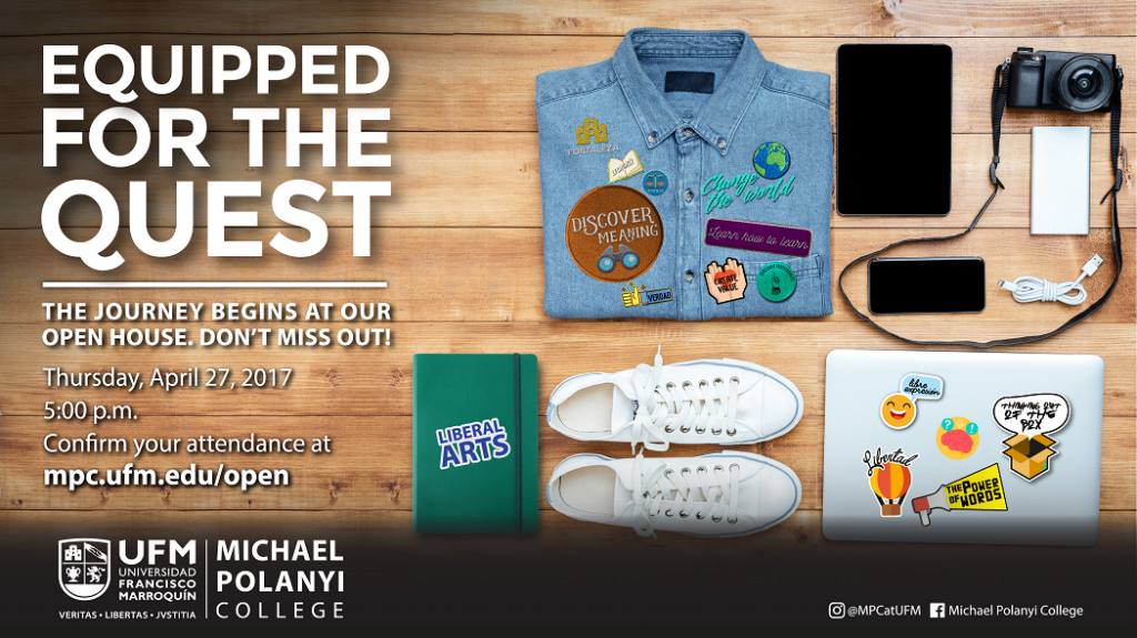 Bajo el lema Equipped for the quest, el Michael Polanyi College de la Universidad Francisco Marroquín invita a que unirse a la conversación y conocer más sobre el MPC. El evento se realizará el jueves 27 de abril a las 5:00 p.m. en el CE-301 del Edificio Centro Estudiantil.